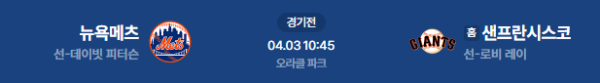 2026년 4월 3일(금) 10:45(KST) 미국 샌프란시스코의 오라클 파크에서 열리는 뉴욕 메츠 vs 샌프란시스코 자이언츠의 MLB 정규 시즌 경기 분석 리포트입니다.