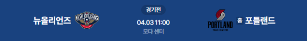2026년 4월 3일(금) 11:00(KST) 미국 오리건주 포틀랜드의 모다 센터에서 열리는 뉴올리언즈 펠리컨스 vs 포틀랜드 트레일블레이저스의 NBA 정규 시즌 경기 분석 리포트입니다.