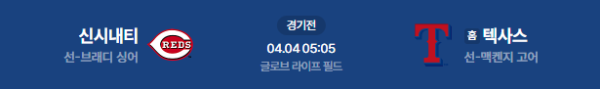 2026년 4월 4일(토) 05:05(KST) MLB 경기 예정: 신시내티 레즈 vs 텍사스 레인저스