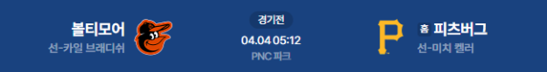 2026년 4월 4일(토) 05:05(KST) MLB 예정 경기: 볼티모어 오리올스 vs 피츠버그 파이어리츠