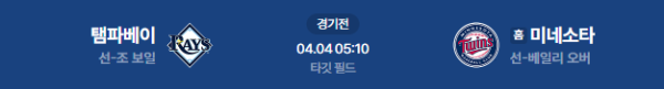 2026년 4월 4일(토) 05:10(KST) MLB 경기 예정: 탬파베이 레이스 vs 미네소타 트윈스