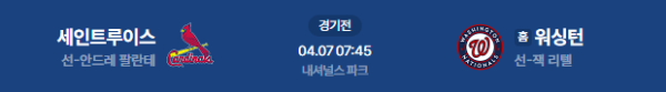 2026년 4월 7일(화) 07:45 (KST) MLB: 세인트루이스 카디널스 vs 워싱턴 내셔널스