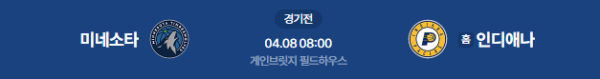 2026년 4월 8일(수) 08:00 (KST) NBA: 미네소타 팀버울브스 vs 인디애나 페이서스