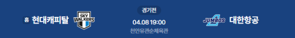 2026년 4월 8일(수) 19:00 (KST) 남자배구: 현대캐피탈 스카이워커스 vs 대한항공 점보스