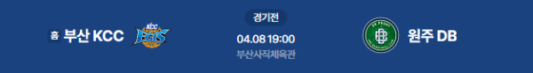 2026년 4월 8일(수) 19:00 (KST) KBL: 부산 KCC 이지스 vs 원주 DB 프로미