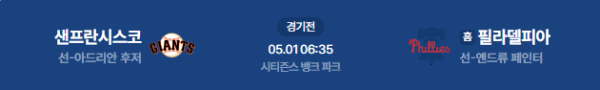 2026년 5월 1일(금) 오전 06:35 (KST) 메이저리그(MLB): 필라델피아 필리스 vs 샌프란시스코 자이언츠