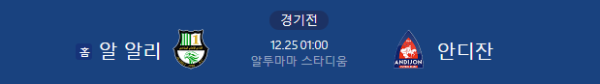 안디잔이 득점이 필요한 상황에서 수비 라인을 올릴 경우, 알 알리의 빠른 전환 공격에 무너질 가능성이 큽니다. 2골 차 이상의 승리 가능성이 충분합니다.