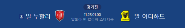 | 경기 양상 예측 | 알 이티하드가 개인 기량을 통해 공격을 풀어가겠지만, 알 두할리 역시 홈에서 쉽게 무너지지 않을 것입니다. 양 팀 모두 공격력이 강하므로 다득점 경기가 될 가능성도 있습니다. |