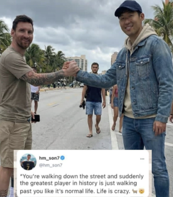 손흥민과 메시가 그라운드에서 만났던 건 2018-2019시즌 유럽축구연맹(UEFA) 챔피언스리그 조별리그 B조 경기였다. 영국 런던 웸블리 스타디움에서 열린 1차전 맞대결에서는 손흥민이 1개의 도움을 기록했고, 메시는 멀티골을 기록하며 소속팀 바르셀로나가 4-2 승리를 거두었다. 이어진 12월 스페인 바르셀로나 캄프 누에서 열린 2차전에서는 양 팀이 1-1 무승부를 거두며 승부를 가리지 못했다.