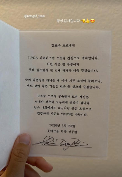 9일 김효주는 자신의 인스타그램 스토리에 신 회장이 지난달 23일 보낸 축하카드를 공개했다. 당시 LPGA투어 포티넷 파운더스컵 우승 직후 받은 것으로 보인다.