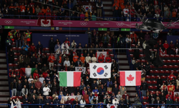 대회 조직위원회는 지난 19일(한국시간) 이탈리아 밀라노 아이스스케이팅 아레나에서 열린 쇼트트랙 여자 3,000m 결승 시상식에서 중앙 태극 문양의 각도가 시계 반대 방향으로 기울어진 태극기를 사용했다.