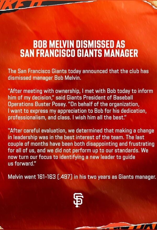 샌프란시스코 구단은 30일(한국시간) 공식 채널을 통해 밥 멜빈 감독을 경질했다고 발표했다. 계약 기간이 1년 남아 있었지만, 2년 연속 포스트시즌 진출 실패 끝에 신뢰를 잃었다.