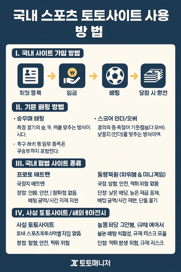 오늘은 많은 분들이 궁금해하시는 국내 스포츠 토토사이트 사용방법에 대해 정리해드리겠습니다. 초보자분들도 쉽게 이해할 수 있도록 가입 절차, 배팅 방식, 그리고 사이트별 특징까지 깔끔하게 안내해드리겠습니다.
